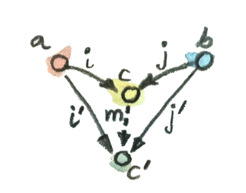 cが広すぎてダメな場合: 適当な集合 dを持ってきて、c=a+b+dで、c’がa+b, i,jはa,bからa+b+dへの埋め込み、i’,j’として、a,bからa+bへの埋め込みを考える。 この場合、m: c -> c’を定義するにあたって、dの要素をどこに移すかに自由度が残ってしまう。